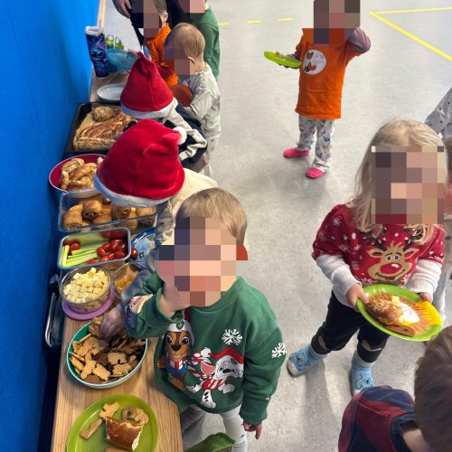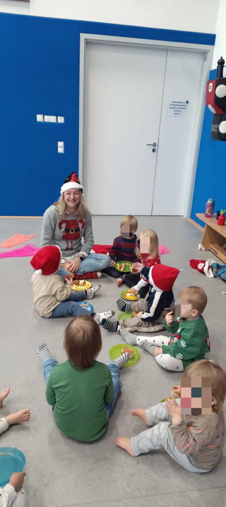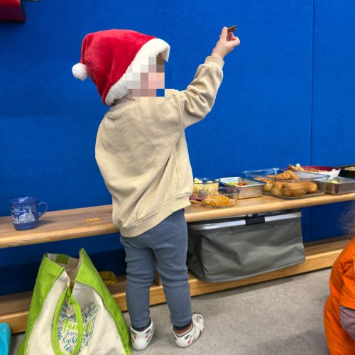 Alle Kinder kamen in ihrer Weihnachtskleidung, und schon beim Ankommen lag ein bisschen Zauber und kindliche Aufgeregtheit in der Luft. Besonders schön war unser kleines Buffet auf Kinderhöhe. Die Kinder konnten ganz in Ruhe entdecken, sich selbst einen Teller nehmen, schauen, was ihnen gefällt, und auswählen, worauf sie Lust hatten.