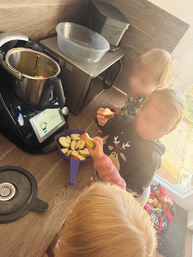 Gemeinsam haben wir beschlossen, daraus Apfelmus zu machen. Schritt für Schritt durften die Kinder selbst tätig werden: Äpfel waschen, schälen, schneiden, rühren und schließlich das Mus probieren. Dabei konnten sie mit allen Sinnen erleben, wie sich die Äpfel verwandeln – vom festen Obst zum duftenden, warmen Mus.