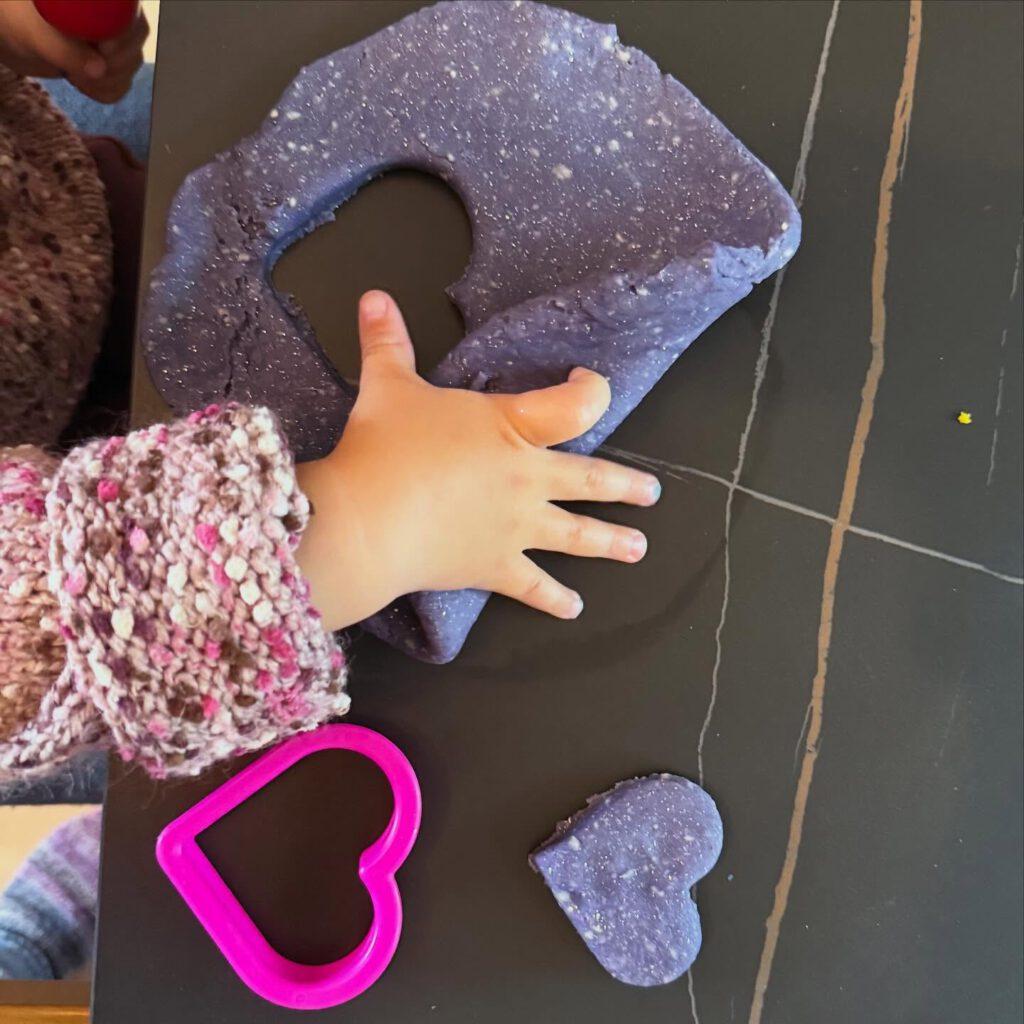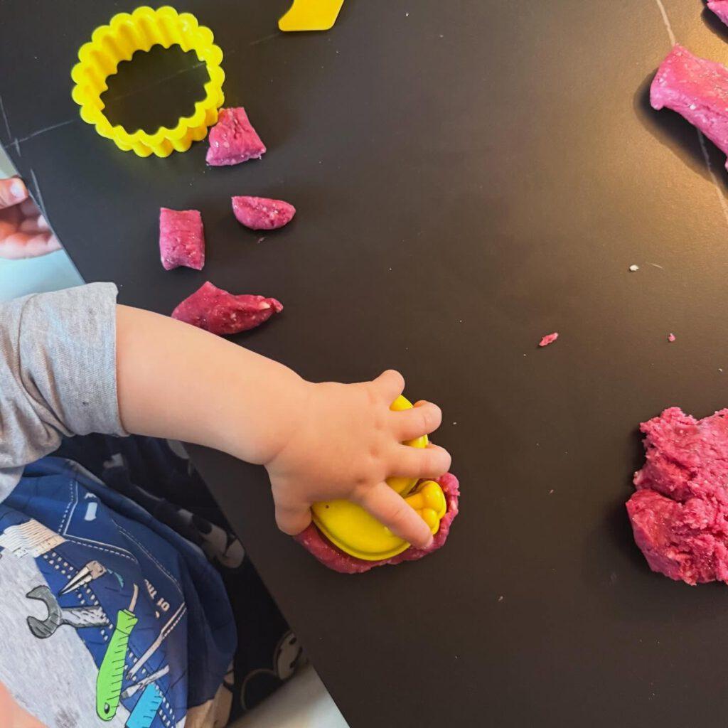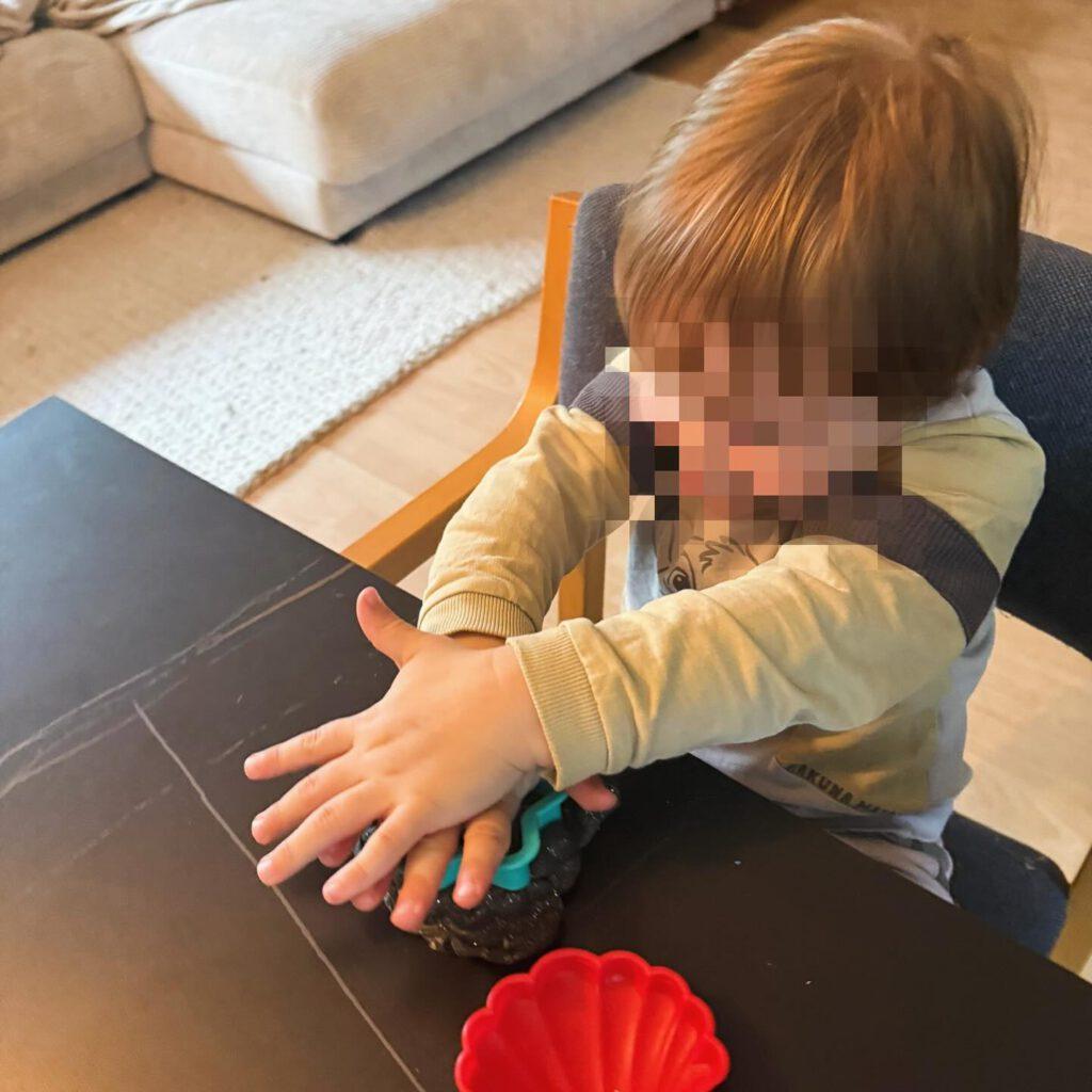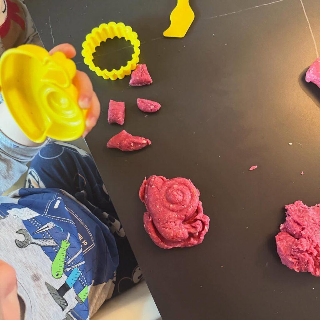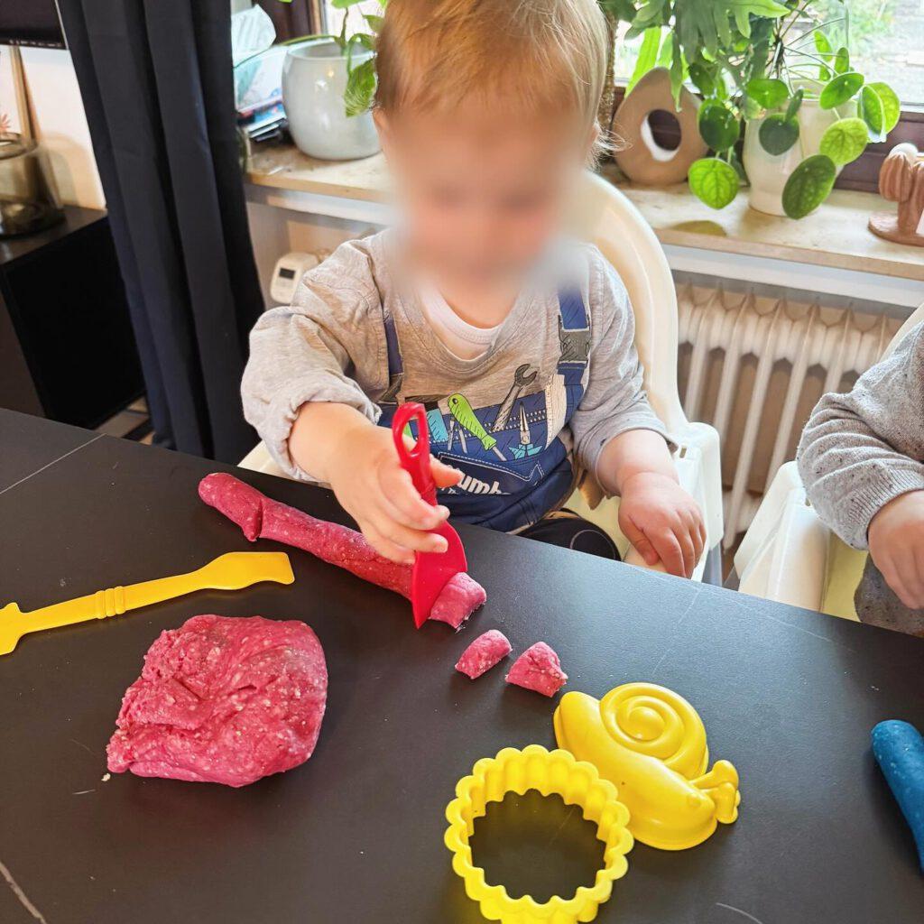 Als die Knete fertig war, begann das freie Spiel: Ein Kind rollte sorgfältig eine lange Wurst und schnitt sie dann in kleine Stücke. Ein anderes drückte die Knete in eine Form und staunte, wie sie sich anpasste. Und eines steckte seine Finger tief hinein – fasziniert von den Spuren, die entstanden.