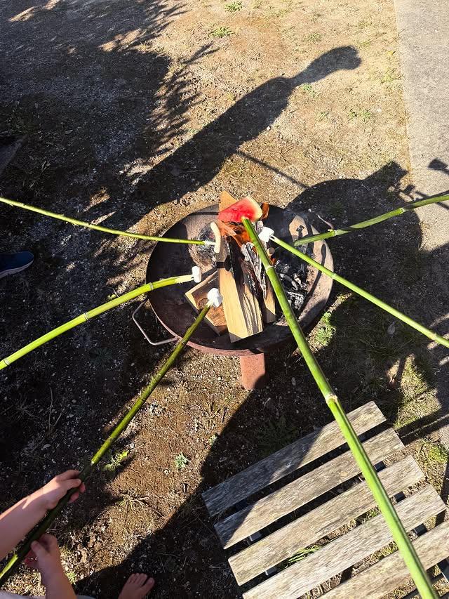 Am Feuer konnten die Kinder mit großer Freude Marshmallows und kleine Würstchen auf Bambusstöckern grillen – ein Erlebnis, das immer wieder aufs Neue fasziniert. Dazu gab es ein reichhaltiges Buffet, zu dem die Eltern liebevoll beigetragen haben. Leider habe ich, wie jedes Jahr, vergessen, ein Foto davon zu machen – der Hunger und die Freude waren einfach schneller.